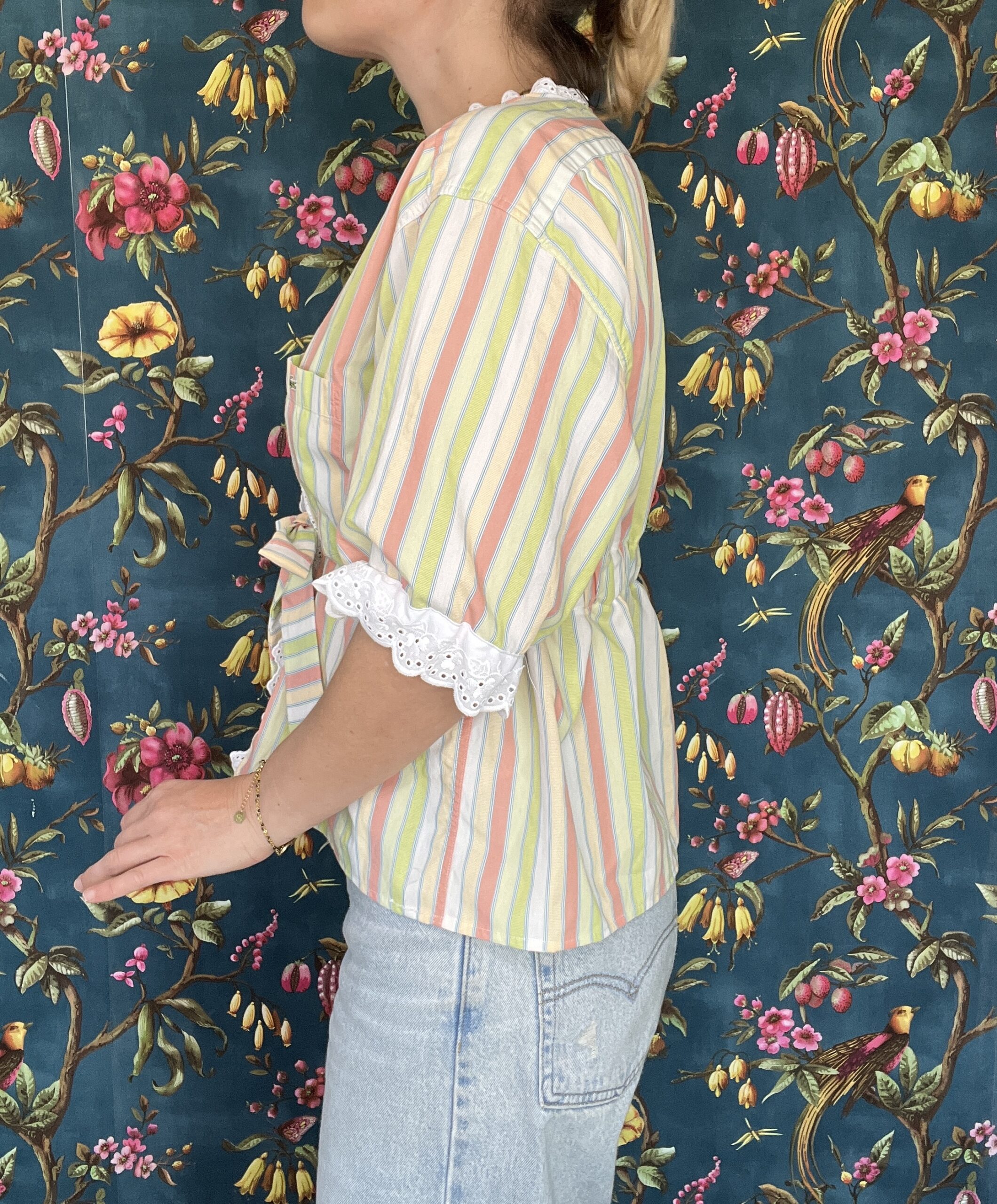 - La boutonnière a été retirée et remplacée par 2 bandes de broderie anglaise